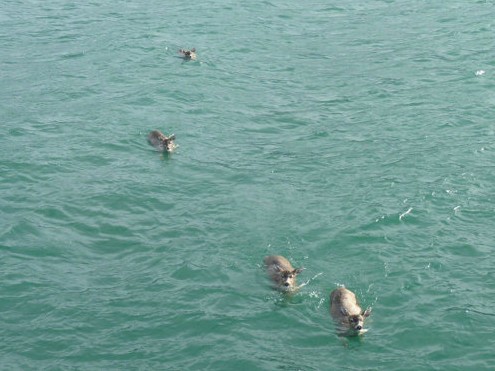 Tom Satre a dit au journal Sitka qu'il était avec un groupe sur un bateau de pêche de 62 pieds quand il a vu 4 jeunes daims nager directement vers son bateau.